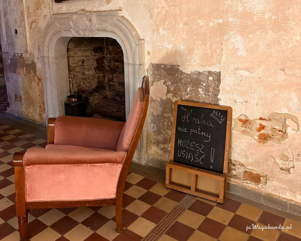 Ściany pałacu, choć nadgryzione przez czas, nadal kryją architektoniczne detale, które przypominają o dawnej świetności tego miejsca.