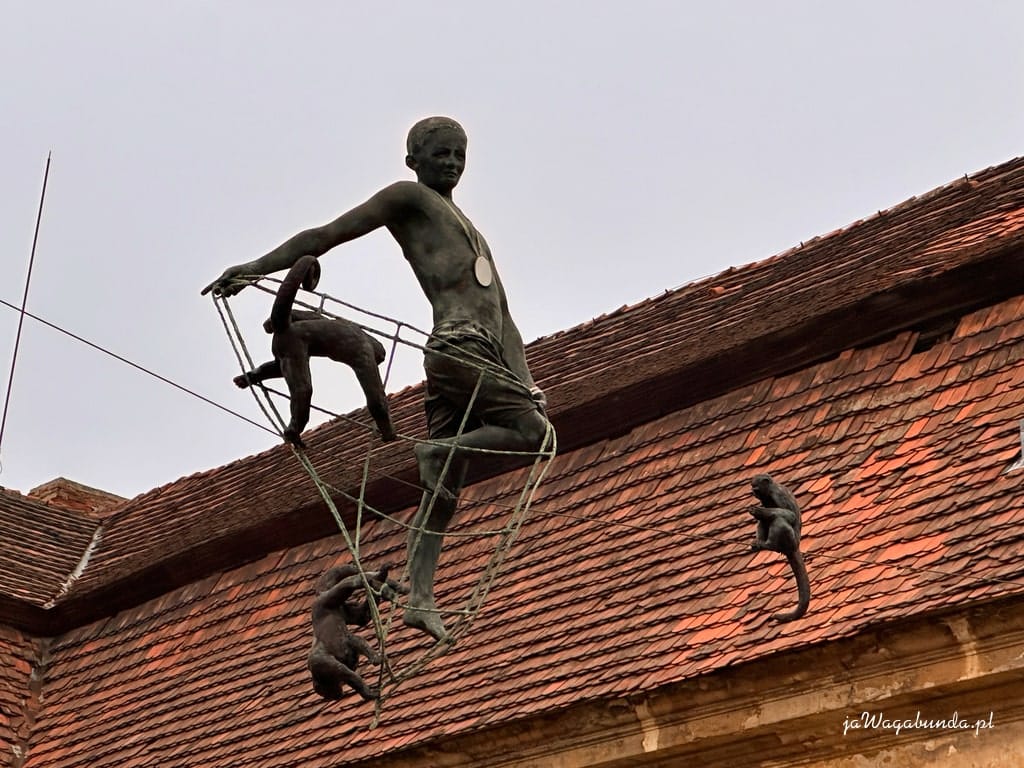 To „Chłopiec z małpkami”. Autorem jest znany artysta Jerzy Kędziora, którego wystawę prac zorganizowano w sezonie 2022 na terenie pałacu i parku.